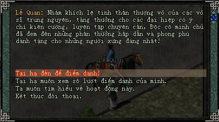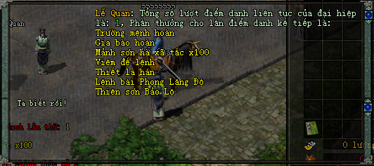 Mỗi ngày quý nhân sỹ chỉ có thể điểm danh 1 lần duy nhất, điểm danh thành công sẽ có thông báo trên kênh chát và vật phẩm tự động thêm vào hành trang người chơi