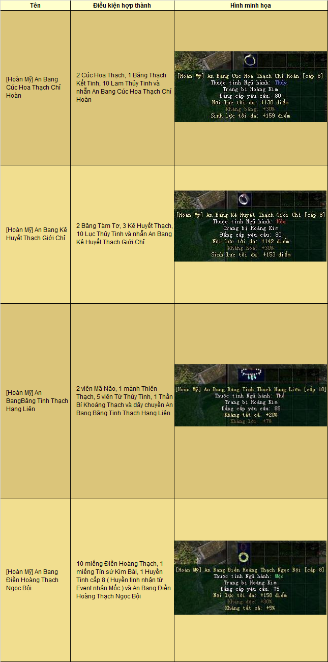 Lưu ý: Khi tiến hành thăng cấp trang bị An Bang Hoàn Mỹ thì cần phải theo thứ tự sau: An Bang Cúc Hoa Thạch Chỉ Hoàn, An Bang Kê Huyết Thạch Giới Chỉ, An Bang Băng Tinh Thạch Hạng Liên, An Bang Điền Hoàng Thạch Ngọc Bội..
