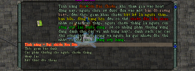 Nhân sỹ báo danh tham gia sẽ được đưa vào bản đồ đặc biệt, sau thời gian báo danh tất cả người chơi sẽ được đưa về 1 bản đồ duy nhất, nơi đây sẽ là nơi tranh tài của chư vị anh hùng, các nhân sỹ sẽ PK lẫn nhau, không phân biệt phe phái, bang hội, người còn sống sót cuối cùng là người chiến thắng.