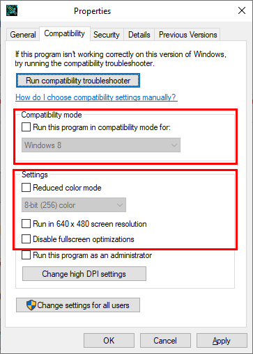 - Đầu tiên vào thư mục chứa Auto chuột phải vào file AutoVLBS.exe chọn Properties > Compatibility ở cửa sổ Compatibility anh em nhìn theo hình dưới nếu có tick vào các ô như trong khung màu đỏ thì tắt hết đi và chọn Apply > OK. Nhớ là tắt cả bên Change settings for all users nữa nha.