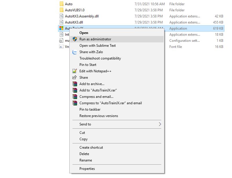 - Khi gặp lỗi này thì anh em tắt AutoVLBS đi và chuột phải mở bằng Run as administrator để Auto sử dụng với quyền cao nhất của máy tính hoặc có thể chỉnh nó luôn luôn sử dụng quyền Administrator để lần sau không cần chuột phải mà chỉ cần bấm đúp chuột là được thì làm nhẹ theo cách sau.