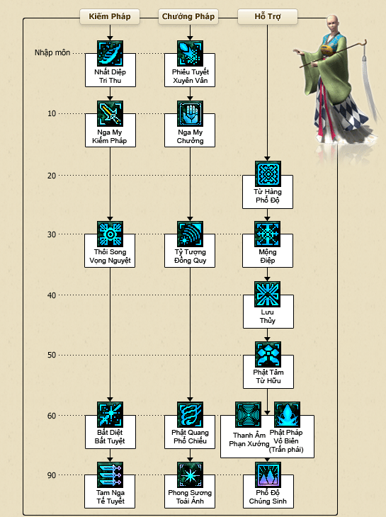 Một số chiêu thức của Nga My: Phiêu Tuyết Xuyên Vân, Túy Tiên Vong Nguyệt, Phong Vũ phiêu Hương, Phật Quang Phổ Chiếu, Bất Diệt Bất Tuyệt.