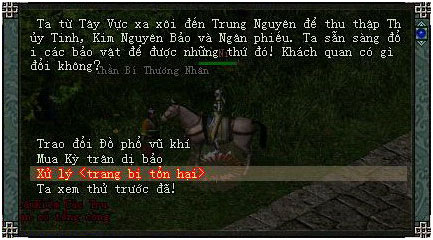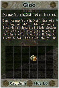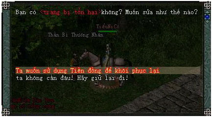 Từ những bước đầu bôn tẩu, cho đến khi đã quen thuộc từng ngõ ngách giang hồ, ai ai cũng đều cố gắng tìm cho mình những trang bị tốt nhất để thuận lợi hơn trong quá trình hành hiệp. Để chọn được một bộ vũ khí, mũ, giày, ... thật ưng ý chẳng dễ dàng gì, vì thế vô tình một lúc nào đó bạn quên sửa chữa trang bị và sau đó trang bị bị hỏng (độ bền = 0) thì quả thật không còn gì tiếc hơn.